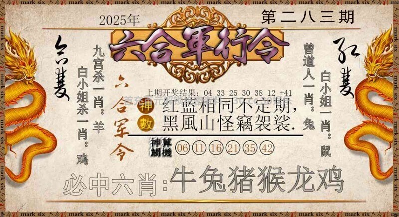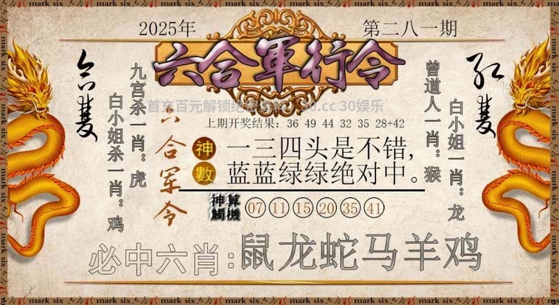 281期⑦肖 | 蛇马鼠牛羊鸡龙 | 开: 羊47 |
